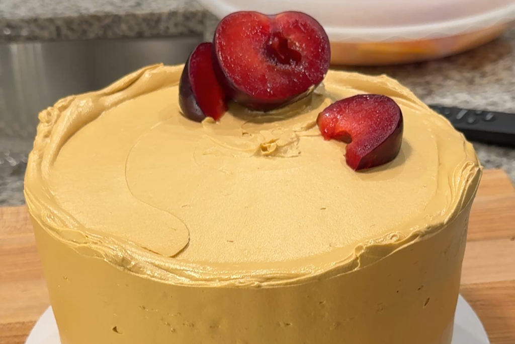 This reverse-creamed almond cake embraces an amaretto-apricot jam filling, crunchy almonds, and a salted dulce de leche Russian-style buttercream.